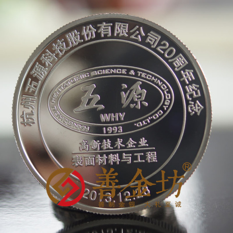 為慶祝杭州五源科技股份有限公司20周年慶典,特制作此章以資紀(jì)念。正面圖案:“杭州五源科技股份有限公司20周年紀(jì)念”、“2013.12.28”、“高新技術(shù)企業(yè)”、“表面材料與工程”及公司LOGO;背面圖案:“杭州五源科技股份有限公司”、“HANGZHOU PENTATOMIC SCIENCE & TECHNOLOGY CO.,LTD.”、“Ag.999 25g”及公司大樓圖案。銀章直徑40毫米,成色99.9%,含純銀25克。
