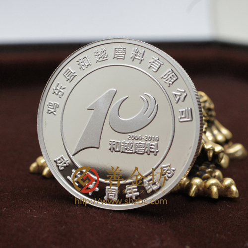 正面圖案:鐫有“雞東縣和越磨料有限公司”、“成立十周年紀(jì)念”等字樣及l(fā)ogo圖案。